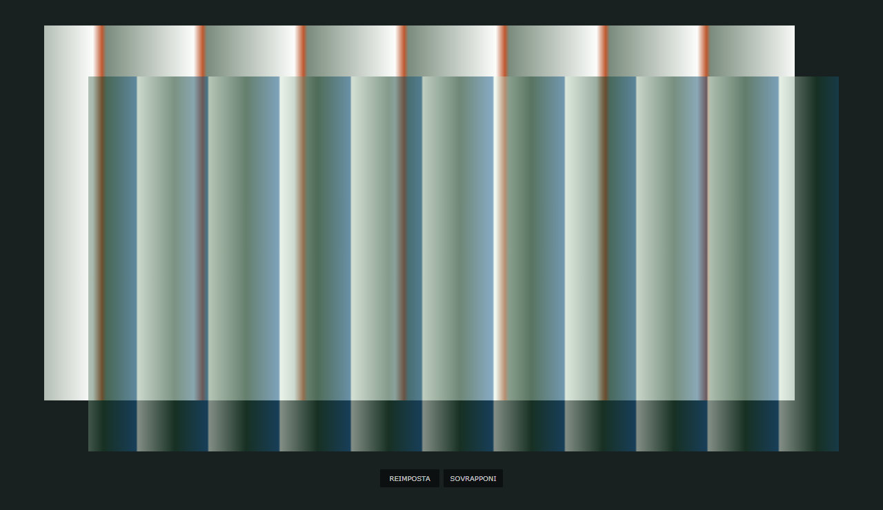 The operation is based on the CSS3 function repeating-linear-gradient() which creates a repeated color gradient indicating the key colors and their positions in the base gradient. The experiment uses two overlapping rectangles and, for each, randomly chooses three colors and gradually changes their positions. The continuous transformations, between ever new surfaces and levels of depth, are the perceptual result of the simple superposition of two animated color gradients.